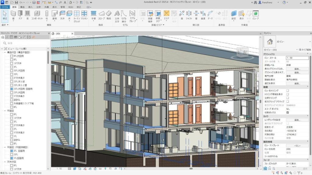 法人様・企業様向けBIM講習会ではBIM操作を主に行いますが、図面を作成するのが目的としております。BIMツールを使えても思い通りの2D図面を出力できないなどの悩みがあります。BIMはCADのようにツールが使えただけではモデリングできません、建築の知識が必要になります。建築の納まりや部材の勝ち負けなどを考えながらモデリングすることが必要になります。REVIT LTはどちらかというと意匠系が得意なBIMです、構造の伏図も書き出せますが鉄器のなどの配筋はできません。意匠に特化したBIMをREVIT LTで覚えませんか、FRENZは実践型BIM講習です!